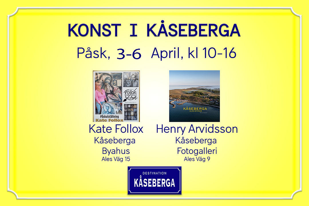 I samarbete med DESTINATION KÅSEBERGA så återkommer Konst i Kåseberga även denna Påsk (under Konstrundan). I Byahuset ställer Kate Follox ut för tredje året i rad och i Kåseberga Fotogalleri ställer Henry Arvidsson ut sina fotografier. Varmt Välkomna